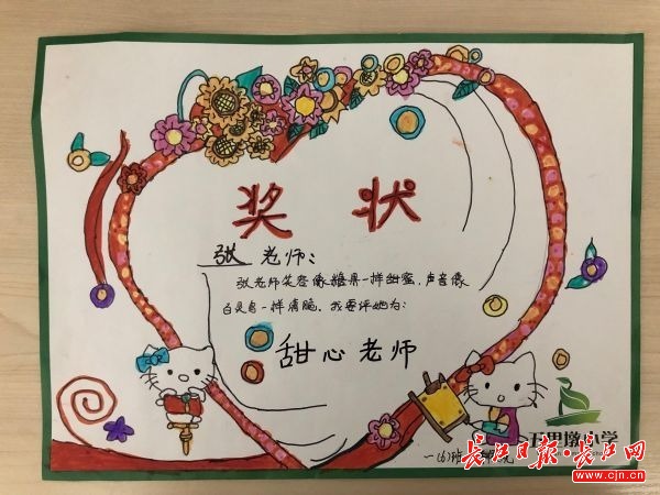 为了给老师们一份惊喜,在教师节来临前夕,五里墩小学的学生们为每位老师精心手绘了一张张奖状,并附上了一段段真诚的颁奖词。“心平气和奖”“课堂享受奖”“工作积极分子奖、“三好老师奖”“春风化雨奖”“人见人爱老师”……都由学生自己设置。