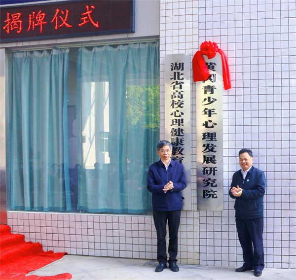 陈向军(右)与何兰田共同为黄冈青少年心理发展研究院揭牌 摄影 张文达
