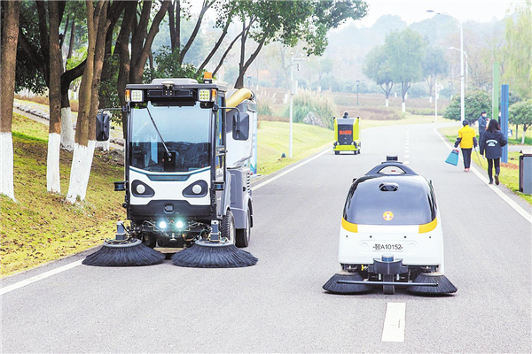 无人驾驶环卫车在龙灵山公园绿道上清扫(摄影 湖北日报全媒记者 梅涛)
