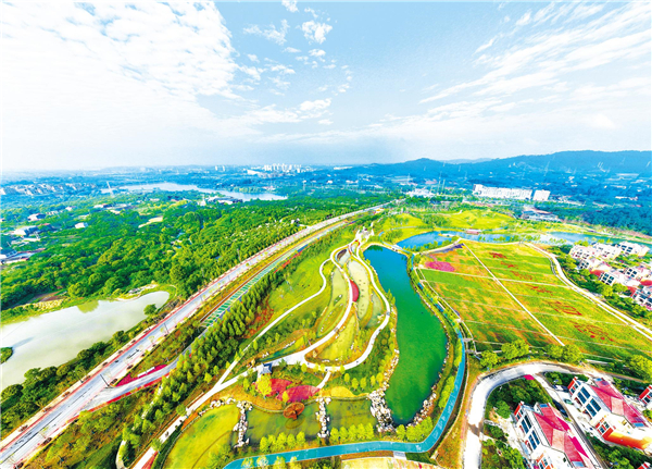 5月10日,无人机拍摄新开园的襄阳襄水源生态公园。作为襄水岸线修复生态提升项目一期工程,襄水源生态公园重塑生态环境,开园以来吸引不少市民前来打卡,水榭亭台、小桥曲径让人流连忘返。(湖北日报全媒记者 田悦 通讯员 谢勇 摄)