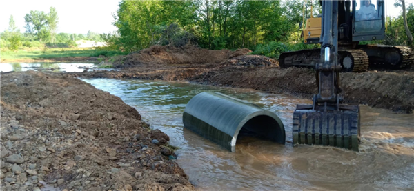 在宋河镇江关村,8月15日中午,村支书欧磊正带着施工人员在河中围堰蓄水。受干旱影响,目前大富水河床断流,河道水位下降,导致泵站无法正常取水抽水,1000多亩稻田亟需灌溉。因此,江关村动用机械,在河道开挖拦水围堰,确保灌溉。欧磊介绍说:“由于长期高负荷运转,位于该村2组的的一台水泵于14日下午损坏,我们立即与武汉的生产厂家联系,目前正在送货途中,16日一大早即可安转并投入使用。”