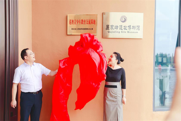荆门市委外办副主任李勇和屈家岭管理区党工委委员、宣传统战部部长王豫鄂共同为“港澳青少年教育交流基地”揭牌。