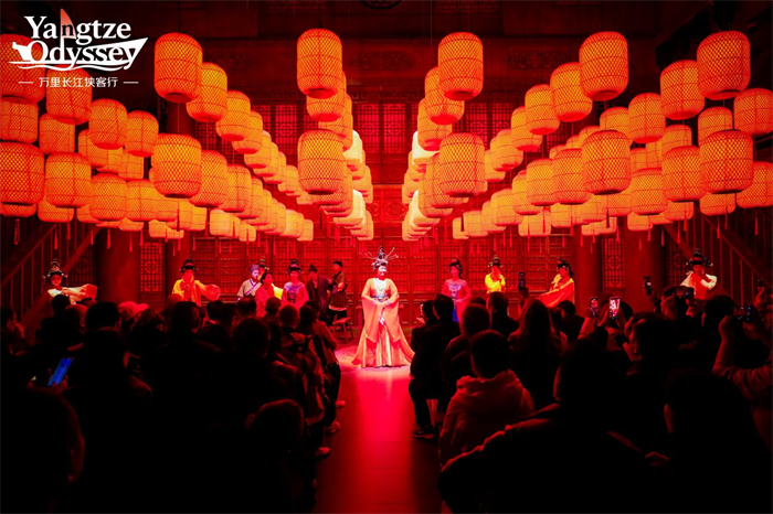 移步《大话武当》演艺厅,嘉宾们瞬间“穿越”进金庸笔下的武侠世界。矩阵灯笼随音乐上下舞动,侠客从高空飞跃而下,武者的拳脚破空声交织成趣,构成一幅鲜活的“武当江湖图”。演出以穿越叙事串联武当传奇,将张三丰创拳典故、太极阴阳理念融入戏剧、武术与舞蹈中,演员与嘉宾近距离互动,席间还能品尝武当养生茶与特色小吃,实现“观演与品食”的双重体验。