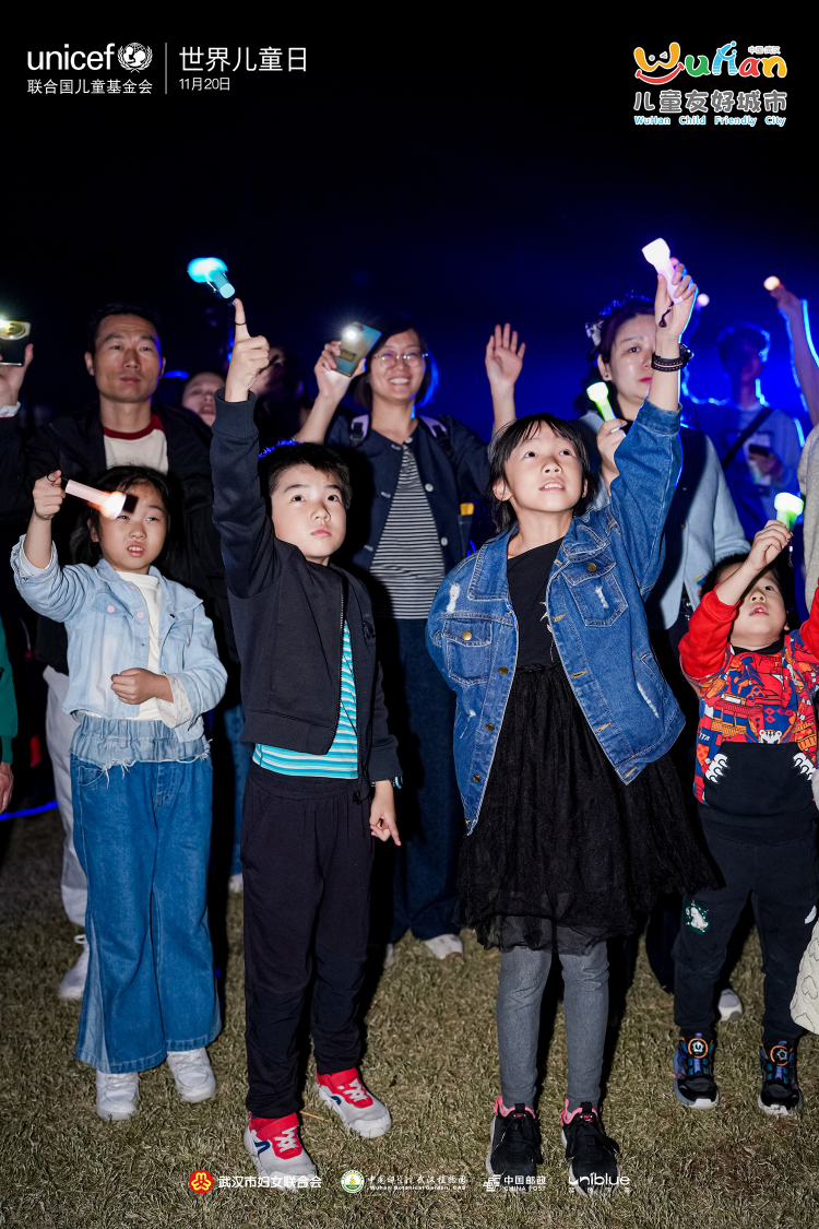 夜幕降临,所有人都围聚在星光森林周围,打开手机、打开手电筒,共同挥舞,如同万千星光。倒计时结束,孩子们一起大喊:“点亮武汉!点亮未来!”,全场的灯光瞬间被点亮,蓝色的灯光透过成千上万个塑料瓶发生柔和的折射,整个“WUHAN”符号变得通透、璀璨、光芒四射,象征儿童梦想点亮城市未来;瓶中的字条在光线的映照下,形成斑驳的阴影,仿佛那些梦想和承诺在光芒中飞舞,让世界看见未来的模样。仪式上,全体参与者共同宣读了《给未来的环保誓言》。随后,所有写满期许的信件被郑重存入特制的时间胶囊内封存,相约至2035年11月20日开启,以此见证时光流转中梦想的成长与城市的变迁。