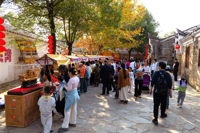 在古村非遗市集,这里汇聚了众多非遗传承人,其中不乏国家级大师。国家级传承人讲述“木兰传说”等黄陂本土国家级非遗故事,船雕、皮塑、泥塑、面塑、剪纸等精湛技艺在现场得以动态展示,工匠们现场制作、销售独具特色的文创产品。这个市集不仅是一个展销平台,更是一个活态的传承课堂和互动体验空间,成为非遗走进现代生活、实现创造性转化和创新性发展的亮丽窗口。