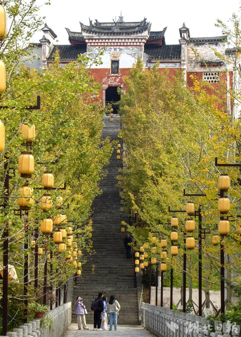 在六角亭老街区,金黄的银杏树叶与武圣宫的城墙、飞檐翘角同框,交相辉映,如诗如画,展现出施州古城的历史韵味。市民和游客纷纷前往游玩赏景,沉浸式体验施州古城的魅力。