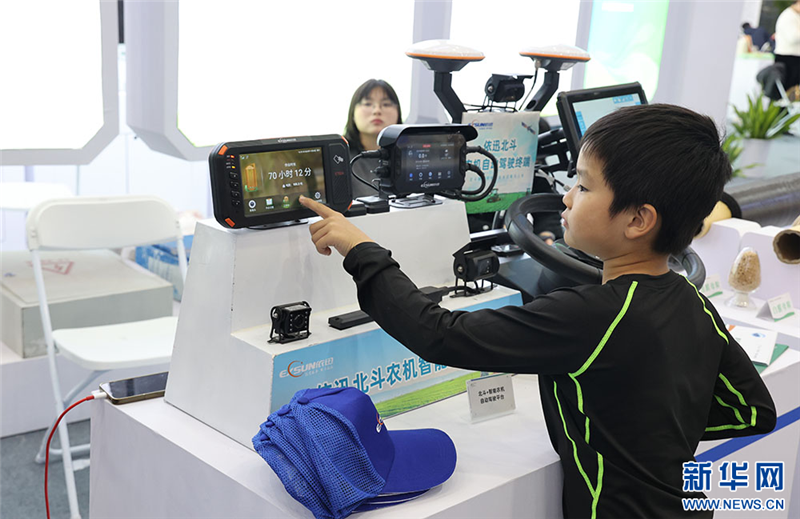 11月29日,小朋友在农博会体验智慧农机具操作。新华网连迅摄