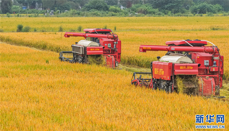 9月23日,收割机在湖北监利稻田收割。新华网发 丁文涛摄