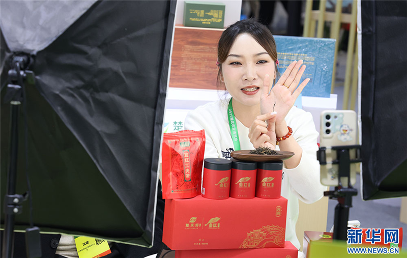11月29日,2025湖北农业博览会上,企业直播销售楚天好茶。新华网连迅摄