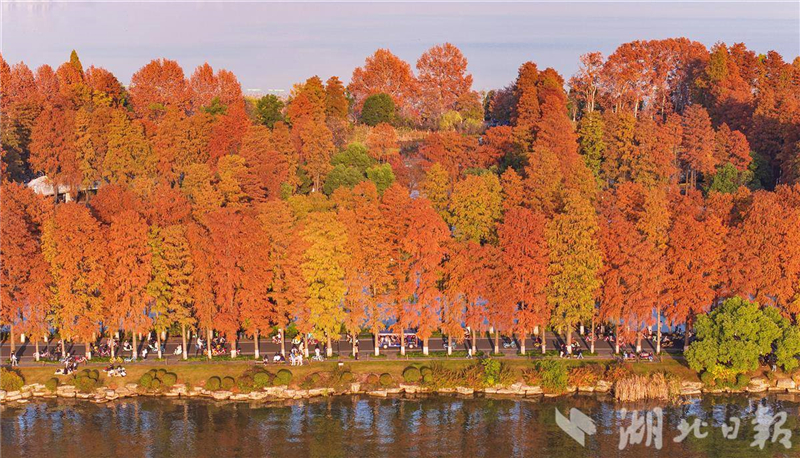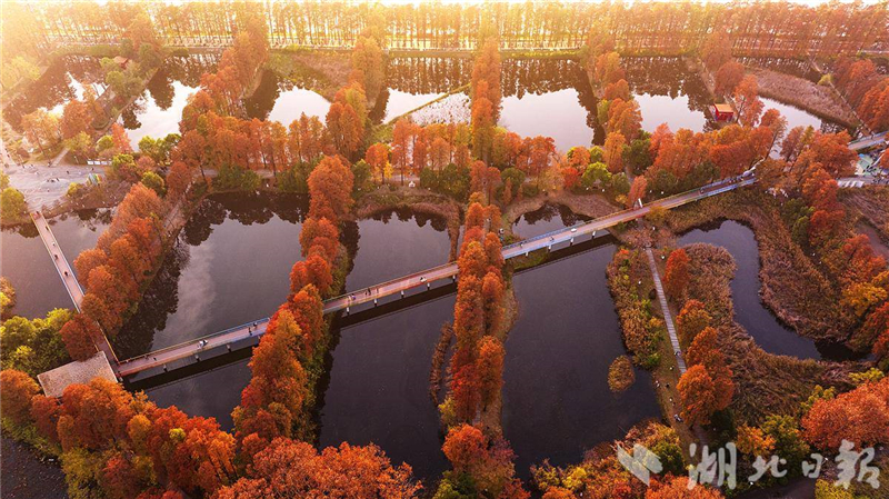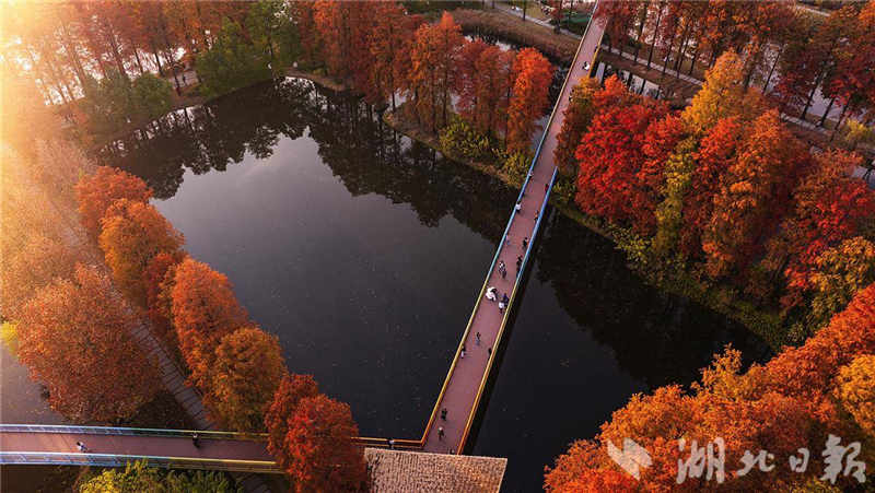 近日,武汉华侨城生态湿地公园内层林尽染,彩虹桥、水榭、亭池、杉树和梧桐树倒映在水中,市民游客或徒步或骑行在如画的美景里。
