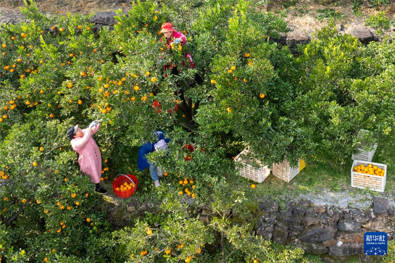 12月11日,在湖北省宜昌市长阳土家族自治县渔峡口镇岩松坪村,村民在采摘清江椪柑(无人机照片)。新华社记者 杜子璇 摄