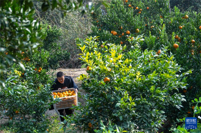 12月11日,在湖北省宜昌市长阳土家族自治县渔峡口镇岩松坪村,村民在搬运刚采摘的清江椪柑。新华社记者 杜子璇 摄