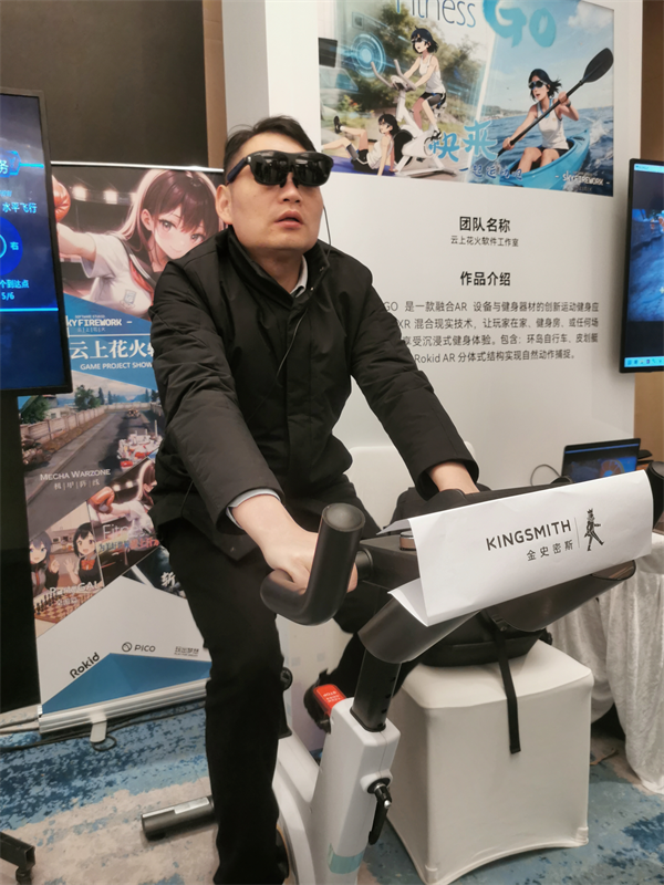 参展观众在体验一款融合AR设备与健身器材的运动健身应用 摄影 胡礼国