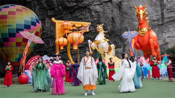 “五、四、三、二、一——亮灯!”上午10时,亮灯仪式正式开启。随着全场齐声倒数,主舞台中央数米高的《骏马踏春》主灯组与洞内万千灯彩同步点亮,雄伟的溶洞殿堂瞬间流光溢彩;22组特色主题灯组依次亮起,舞台前电子烟花腾空绽放,灯影与花火交相辉映,节日氛围感拉满。腾龙洞口上空,天女扮相的舞者凌空翩跹,扬手间,花瓣簌簌洒落,缤纷花雨漫天翻飞,如梦似幻。