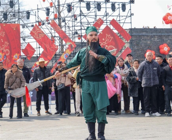下午3时,大北门朝宗楼下,《三国英雄路》实景短剧正在上演。刘备、关羽、张飞等“三国英雄”甫一亮相,便成为现场焦点,国内外友人秒变“粉丝”争相合影。来自仙桃市的三胞胎姐妹、乌克兰小伙丹尼尔等游客先后与“三国英雄”同框,他们纷纷点赞:“荆州春节好玩!有趣!”