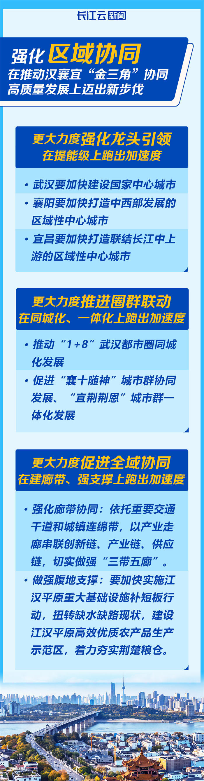 无论是规模能级、区位优势,还是创新能力、产业基础等方面,武汉、襄阳、宜昌三个城市实力都很强劲。汉襄宜携手,这个“金三角”一旦做起来,不仅能成为支撑湖北发展的“金三角”,也能成为撬动中部地区崛起的“金三角”,引领长江经济带高质量发展的“金三角”,服务全国构建新发展格局的“金三角”。