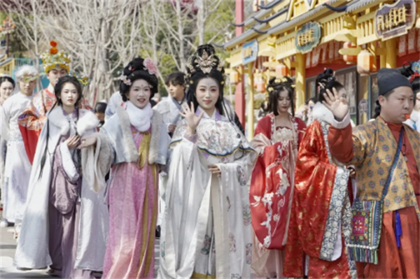 正月初一,恩施女儿城人山人海、热闹非凡,来自天南海北的游客被热腾腾的喜悦裹挟着前行。地道的恩施方言与武汉话、重庆话、湖南话交织,北方游客拉着行李箱在花车前惊喜直播:“这才是过年的天花板!”身着民族盛装的“NPC天团”——李白、上官婉儿、财神爷在人潮中派发“新春银票”,对诗赢礼互动妙趣横生。