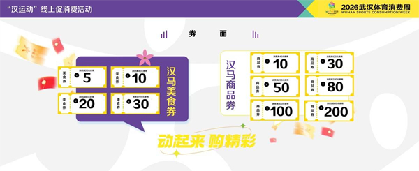 2026武汉体育消费周期间将持续举办“汉运动”线上促消费活动,通过“汉运动”微信小程序发放1000万元体育消费券。本次体育消费券在使用场景上进一步扩容,合作商圈数量、合作商户规模较2025年大幅提升。