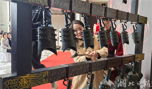英国驻汉总领事夫人陈喜儿体验编钟。(湖北日报全媒记者甄子萱 摄)