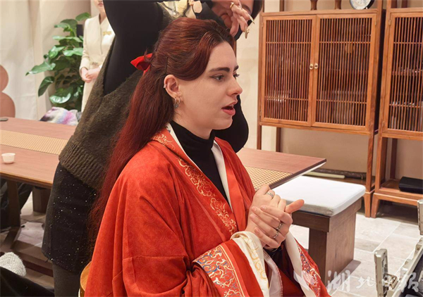 西班牙籍湖北大学外教Garcia Noa则在活动现场圆了自己的“汉服梦”。身着传统汉服的她难掩兴奋,她坦言,此前在网络视频中就对汉服充满好奇,一直想知道汉服宽大的袖子里藏着什么“奥秘”,这次亲身试穿体验,让她真切感受到了中华传统服饰文化的独特魅力,“这种感觉太神奇了,每一处细节都藏着东方文化的美感”。