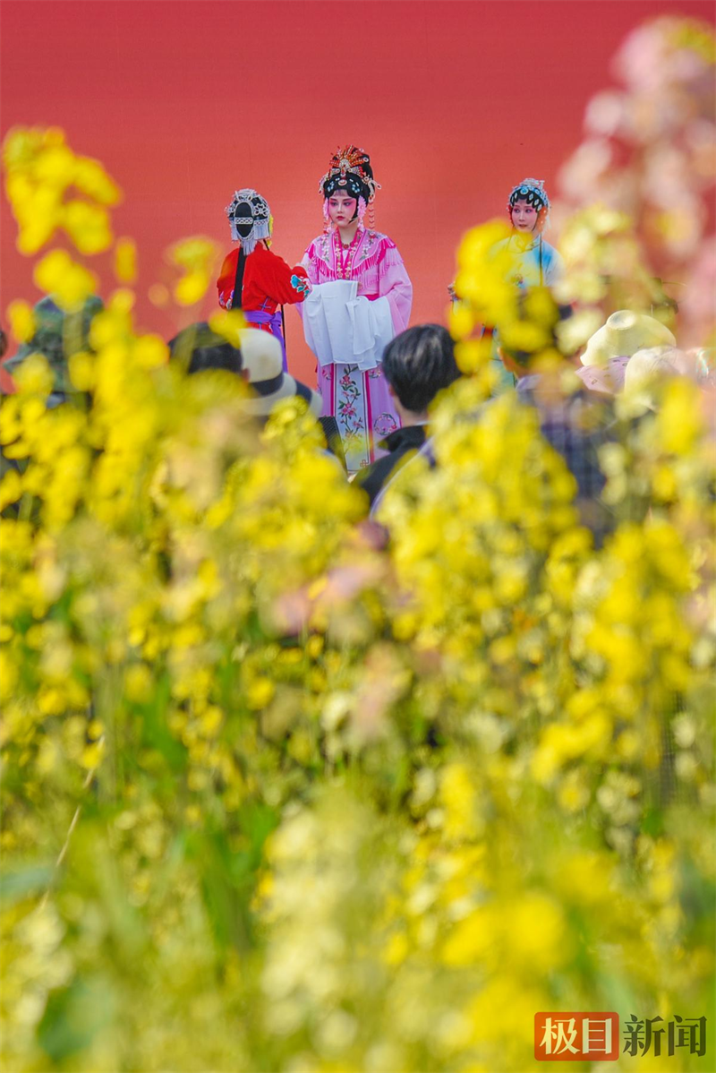 3月13日,荆州花鼓戏表演者在监利市程集镇金草帽现代农业基地的连片油菜花海中演绎。(极目新闻记者 黄志刚 摄)
