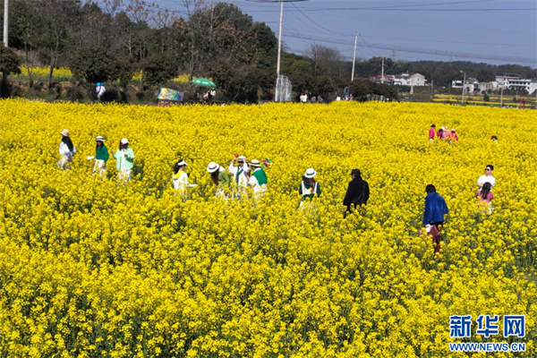 在马桥花海,3000亩油菜花迎风摇曳,金灿灿的花浪翻滚,浓郁花香扑面而来。春日里,这里每天都能吸引近6000名游客徜徉花间,也带动了当地农特产品销售。