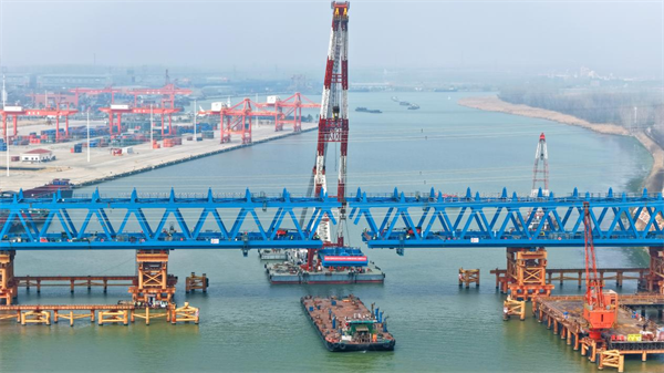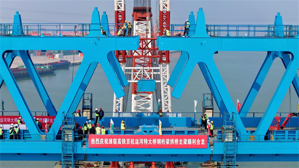 3月25日,随着最后一节钢桁梁精准吊装就位,由在鄂央企中交二航局承建的潍宿高铁江苏段站前3标项目京杭运河特大桥钢桁梁拱桥主梁顺利合龙,标志着潍宿高铁建设取得关键性突破,为全线建成通车按下“加速键”。