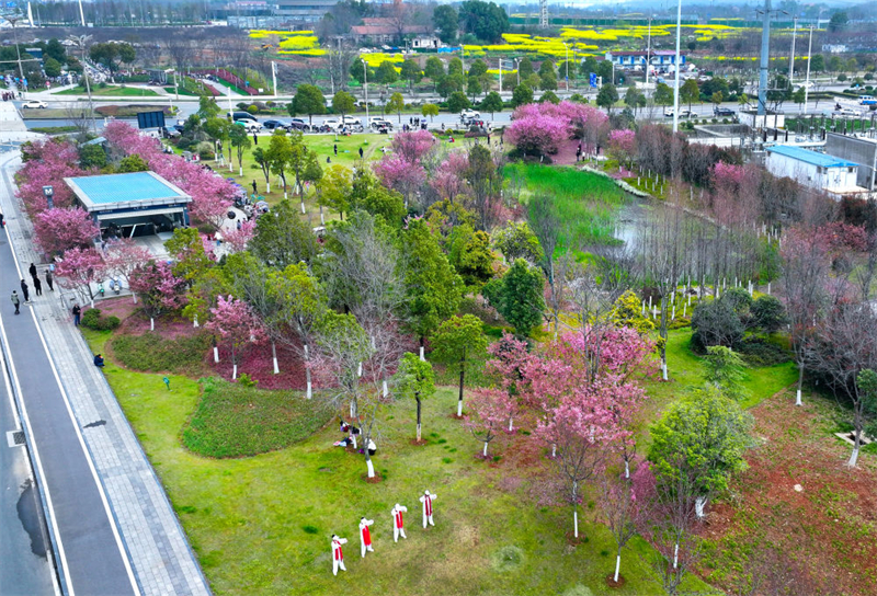 武汉地铁11号线未来三路站旁边的街边公园满树繁花。新华社发(产启斗 摄)