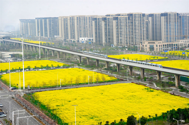武汉地铁16号线穿越武汉经开区的油菜花海。新华社发(产启斗 摄)