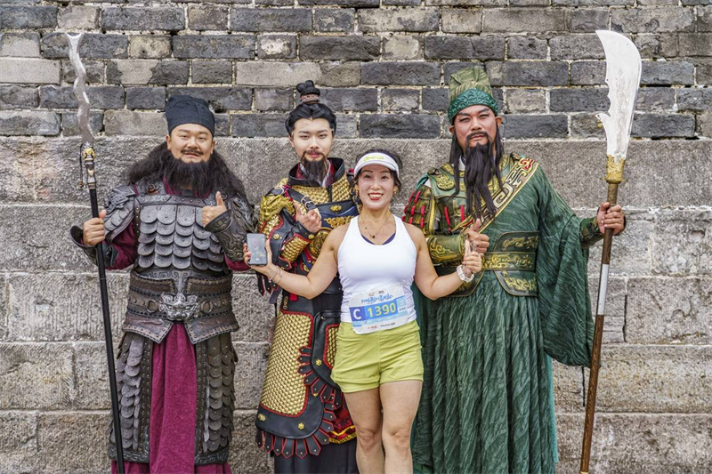 荆州马拉松赛道上,刘关张三国助威团很抢眼。(赛事组委会供图)