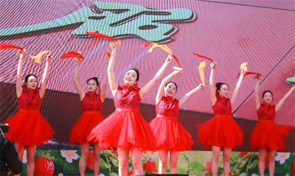 活动以杨集社区为主会场,联动全镇优质草莓种植基地,设置开幕式文艺演出、九大主题沉浸式体验板块及线上互动征集活动。开幕式上,原创音乐快板《草莓飘香润丰乐》以说唱形式生动讲述了草莓产业的发展历程。原创歌曲《丰乐草莓红》更是将丰乐草莓的香甜滋味、丰收的喜庆氛围融入原创旋律与灵动舞姿中,把一颗颗草莓成为乡村致富“金果果”的动人图景呈现在舞台上,赢得现场观众阵阵喝彩。