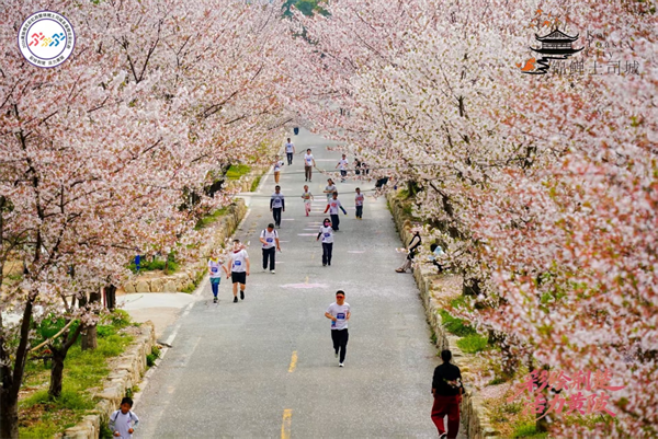锦鲤土司城是武汉热门樱花观赏地之一,坐拥2万余株樱花。环绕赏月湖近200亩的区域,人工培育的樱花沿环湖步道次第开放,粉白相间,山林间的中华樱花(崖樱、单齿樱、刺毛樱桃)自带野趣,漫山遍野,让人仿佛闯入世外桃源。3月29日正值樱花最佳观赏期,中樱全面绽放,晚樱蓄势待发,“湖光潋滟、樱花叠雪”的震撼景观为本次彩虹跑增添了独特的浪漫氛围。