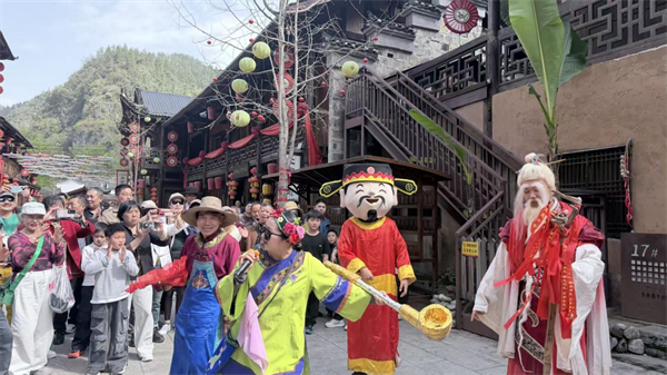 在传统核心景区方面,“两坝一峡”游船线路在清明首日便迎来客流高峰。景区推出的古风迎宾、IP巡游等活动让游客登船伊始便仿佛穿越古今。而在鸣翠谷景区,精彩的非遗表演人头攒动,吸引了大量民俗爱好者围观驻足。车溪老街同样开启了“人从众”模式,各类民俗非遗好戏连台,热闹非凡。