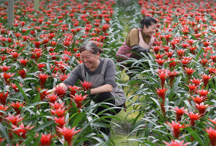 在湖北荆门钟祥市柴湖镇,4000余亩花卉产业园连片铺展,一个个标准化智能温室大棚错落有致,在春日暖阳下格外醒目。步入棚内,红掌、凤梨等盆栽生机盎然,村民穿梭其间,修剪枝叶、精心管护;园区外,工人们快速分拣、打包,将花卉销往全国各地。