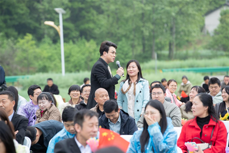 国家级非遗随州花鼓戏亮相舞台,随州花鼓艺术剧院带来经典选段《刘海戏金蟾》之“春风日暖”,一板一眼、韵味十足;喜庆欢腾的歌曲《大花轿》节奏明快,将幸福生活的红火景象展现得淋漓尽致。两轮趣味猜谜环节紧扣随州特色,曾侯乙编钟、随州香菇、银杏、花鼓戏、新四军第五师旧址、中国专用汽车之都等谜底轮番揭晓,村民踊跃抢答。