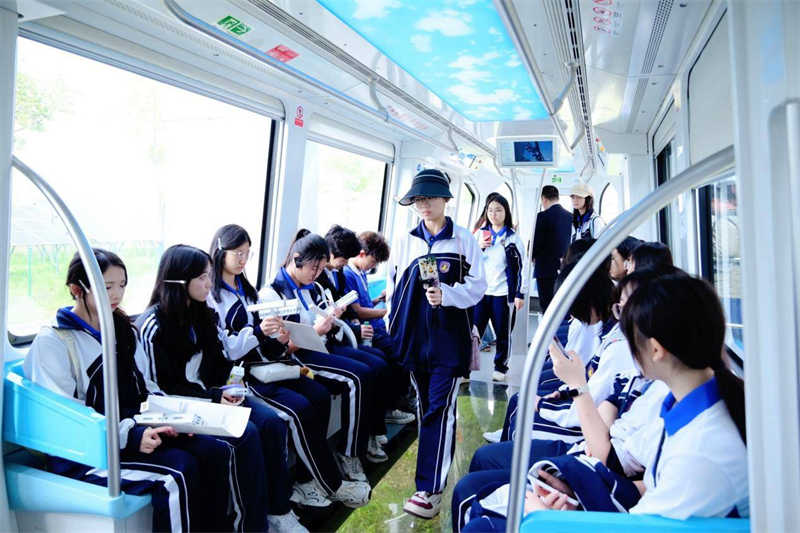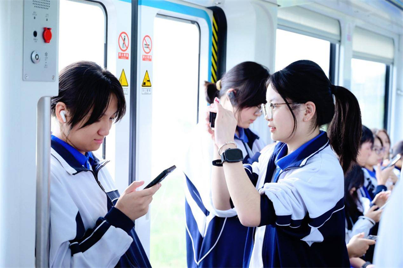 4月24日,学生们登上了国内首条商业运营的空轨线路——“光谷光子号”。列车全自动驾驶,车底的透明观景窗将沿途生态走廊一览无余。高二学生张留嘉难掩兴奋:“坐空轨圆了我一个小小的梦想——我一直想坐那种不在地面上、快速又轻盈的交通工具。”他告诉记者,空轨带来的不仅是科技震撼,更启发了对城市空间的思考:如果交通能向空中或地下延伸,地面就能腾出更多空间用于绿化和居住。在他看来,光谷仿佛是“武汉的南山区”,空轨不仅是一项技术创新,更是一种城市发展理念的落地。